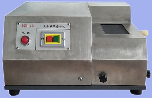 MY-1型光譜砂帶磨樣機的工作原理。電機主軸上安裝帶橡膠的大滾筒,帶動經砂帶連接的從動小滾筒,在電機的驅動下砂帶作直線運動,將磨樣放在砂帶上即可進行試樣的磨削以滿足光譜測量對試樣的要求。