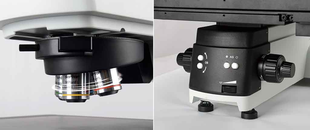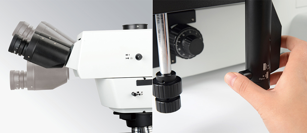 透反機(jī)架,前置低手位粗微同軸調(diào)焦機(jī)構(gòu)。粗調(diào)行程 35mm,微調(diào)精度